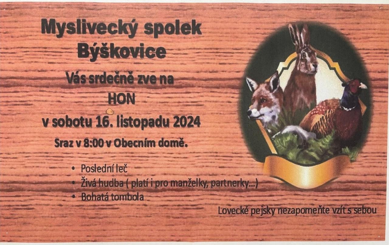 Myslivecký spolek Býškovice Vás srdečně zve na HON, který pořádá tuto sobotu 16.11.2024. Sraz je ráno v 8:00 v Obecním domě. Těšit se můžete také na Poslední leč s živou hudbou, zvěřinovým guláškem a bohatou tombolou.